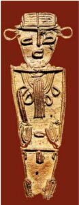 Was jedoch erzählen uns die „tunjos“? Wie bereits oben erwähnt, gibt es neben den unzähligen flachen, zweidimensionalen „tunjos“ auch einige wenige dreidimensionale, die szenische Darstellungen sind. Der berühmteste „tunjo“ befindet sich im Goldmuseum in Bogotá: Es ist das Floß des El Dorado, des goldenen Mannes.